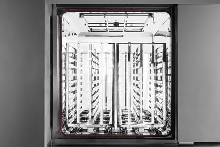 High-quality ASI 316L stainless steel chamber and jacket guarantee long-term reliability and steam cleanliness. The chamber is self-draining with a cylindrical or rectangular cross section and covered by a full jacketed system of dimple welded type for fast and uniform heat transfer and optimization of chamber temperature distribution. The machine body is completely insulated with ceramic material and with external cladding stainless steel. Piping is in compliance with ASME BPE made of AISI 316L stainless steel with tri-clamp fittings and all machine components of sanitary type.